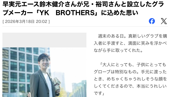 記事が公開されました「早実元エース鈴木健介さんが兄・裕司さんと設立したグラブメーカー『YK BROTHERS』に込めた思い」